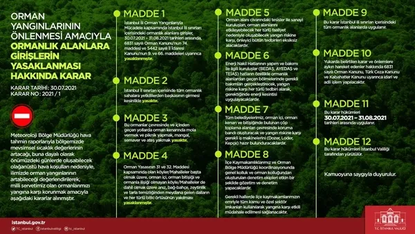 -İstanbul İli Orman Yangınlarıyla Mücadele kapsamında İstanbul İli sınırları içerisindeki ormanlık alanlara girişler, 30.07.2021 – 31.08.2021 tarihleri arasında, 6831 sayılı Orman Kanunu’nun 74. maddesi ve 5442 sayılı İl İdaresi Kanunu’nun 9. ve 66. maddeleri uyarınca yasaklanmıştır.