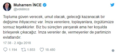 CHP’de muhaliflerin olağanüstü kurultay için 630 imza toplandığını açıklamasının ardından Muharrem İnce’den ilk değerlendirme geldi. İnce, resmi Twitter hesabından açıklama yaptı: