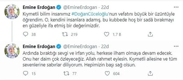 EMİNE ERDOĞAN’DAN, PSİKOLOG VE YAZAR DOĞAN CÜCELOĞLU İÇİN BAŞSAĞLIĞI MESAJI: