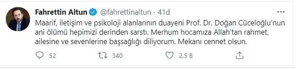 İletişim Başkanı Fahrettin Altun da, Doğan Cüceloğlu için Twitter hesabından bir mesaj yayımladı. Altun mesajında şunları ifade etti: