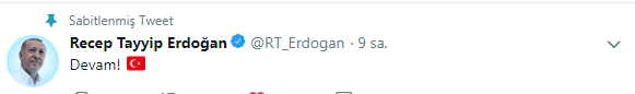 Cumhurbaşkanı Erdoğan seçim zaferinin ardından Twitter hesabından yaptığı ilk paylaşımda ‘devam’ dedi. Erdoğan’ın bu tweeti rekor sayıda RT ve beğeni aldı.