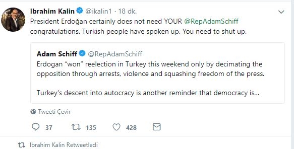 ABD’li meclis üyesi Adam Schiff‘in Erdoğan’ın tartışmasız zaferiyle sonuçlanan seçimler sonrası twitter hesabından paylaştığı, “Erdoğan, bu hafta sonu Türkiye’de sadece tutuklama, şiddet, basın özgürlüğünü kısıtlayarak ve muhalefeti ortadan kaldırarak yeniden seçimleri “kazandı”. Bu Türkiye’nin otokrasiye dönüşmesi, demokrasinin dünya çapında saldırıya uğradığı konusunda bir başka hatırlatmadır. O yüzden tebrik etmiyorum” mesajına Cumhurbaşkanlığı Sözcüsü İbrahim Kalın‘dan tokat gibi cevap geldi.
