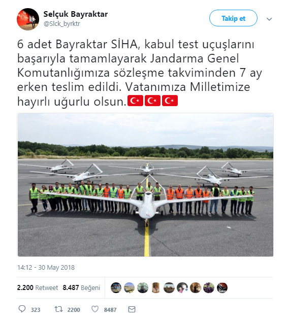 Milli gururumuz İHA ve SİHA’ların üreticisi Baykar Makina Teknik Müdürü Selçuk Bayraktar, Twitter’dan yaptığı paylaşımda “6 adet Bayraktar SİHA, kabul test uçuşlarını başarıyla tamamlayarak Jandarma Genel Komutanlığımıza sözleşme takviminden 7 ay erken teslim edildi. Vatanımıza Milletimize hayırlı uğurlu olsun” bulundu.