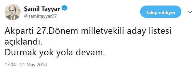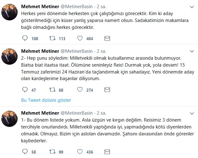 AK Parti milletvekili aday listesinin açıklanmasının ardından Mehmet Metiner, Şamil Tayyar, Metin Külünk ve Reşat Petek Twitter’dan açıklamalarda bulundu. Milletvekilleri listelerinin “hayırlı” olmasını dilerken, Metiner’in, “Kim ki aday gösterilmediği için küser yanlış yaparsa namert olsun” ifadeleri dikkat çekti.