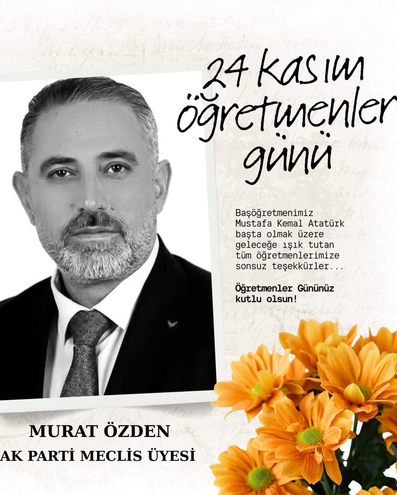 Meclis Üyesi Murat Özden Öğretmenler Günü’nü unutmayarak bir mesaj yayınladı. Özden mesajında, ‘Aydınlık yarınlarımızı gayretle ve özveriyle inşa eden, millî ve manevî değerlerimize sadık nesillerin yetişmesinde emeği olan Öğretmenlerimizin “Öğretmenler Günü”nü en içten dileklerimle tebrik ediyorum’ açıklamasında bulundu.