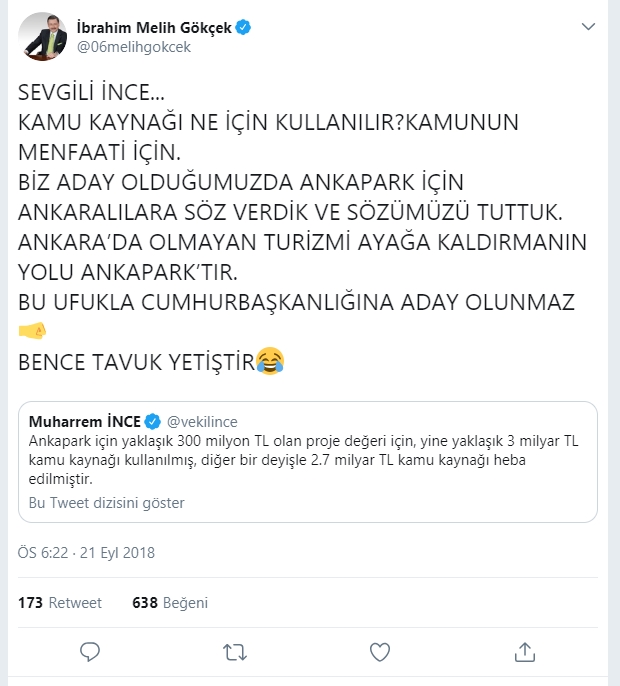 Muharrem İnce’nin “Ankapark için yaklaşık 300 milyon TL olan proje değeri için, yine yaklaşık 3 milyar TL kamu kaynağı kullanılmış, diğer bir deyişle 2.7 milyar TL kamu kaynağı heba edilmiştir.” sözlerini alıntılayarak cevap veren Melih Gökçek “Sevgi̇li̇ İnce… Kamu kaynağı ne i̇çi̇n kullanılır? Kamunun menfaati̇ i̇çi̇n. Bi̇z aday olduğumuzda Ankapark i̇çi̇n Ankaralılara söz verdi̇k ve sözümüzü tuttuk. Ankara’da olmayan turi̇zmi̇ ayağa kaldırmanın yolu Ankapark’tır. Bu ufukla cumhurbaşkanlığına aday olunmaz. Bence tavuk yeti̇şti̇r.” ifadelerinden bulundu.