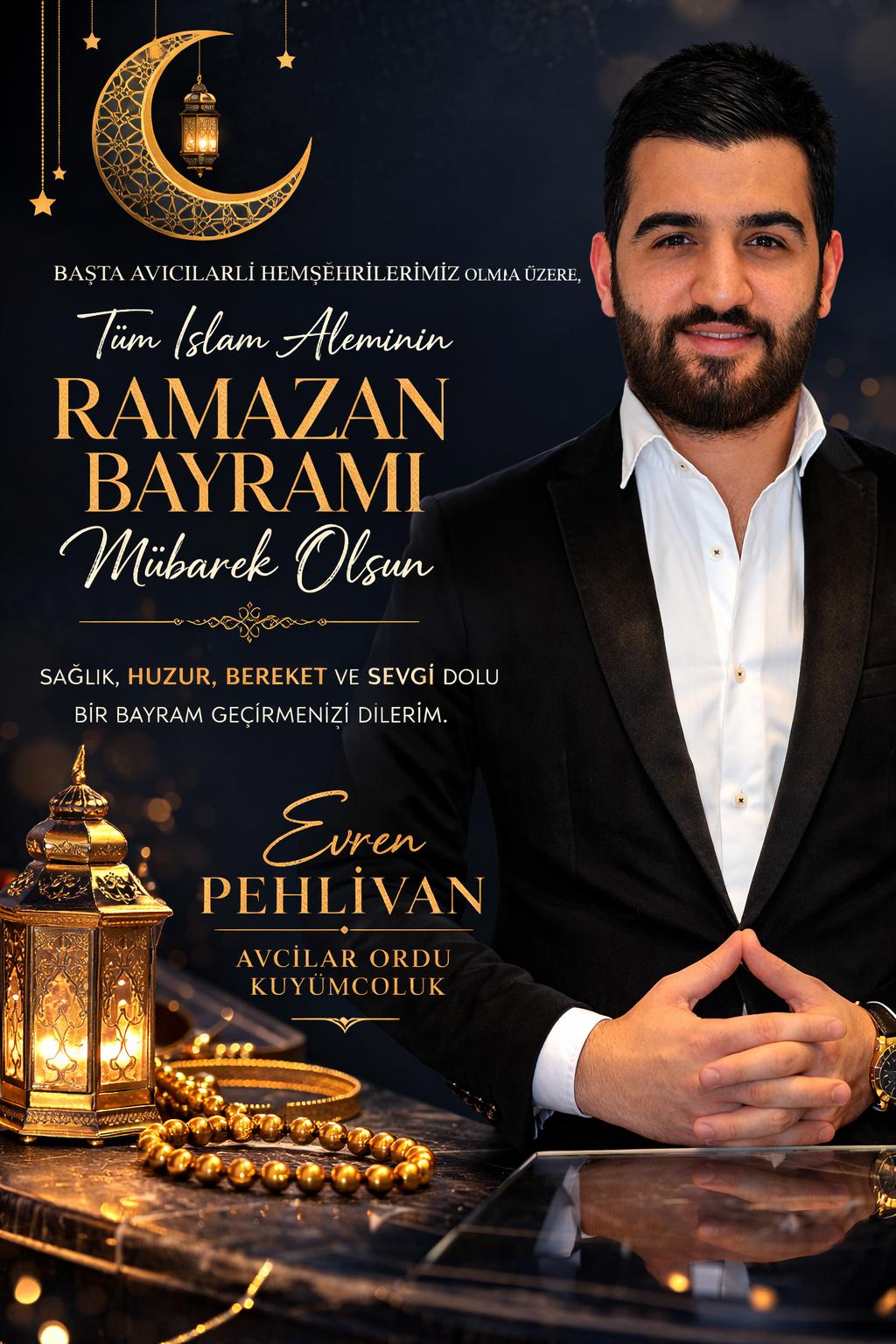 Evren PEHLİVAN – AVCILAR ORDU KUYUMCULUK: Kainatın yaratıcısı ve alemlerin Rabbi yüce Allah’a sonsuz şükürler olsun! Ramazan bereketiyle, bolluğuyla gelsin, tüm insanlık için hayırlara vesile olsun. İyi Bayramlar…