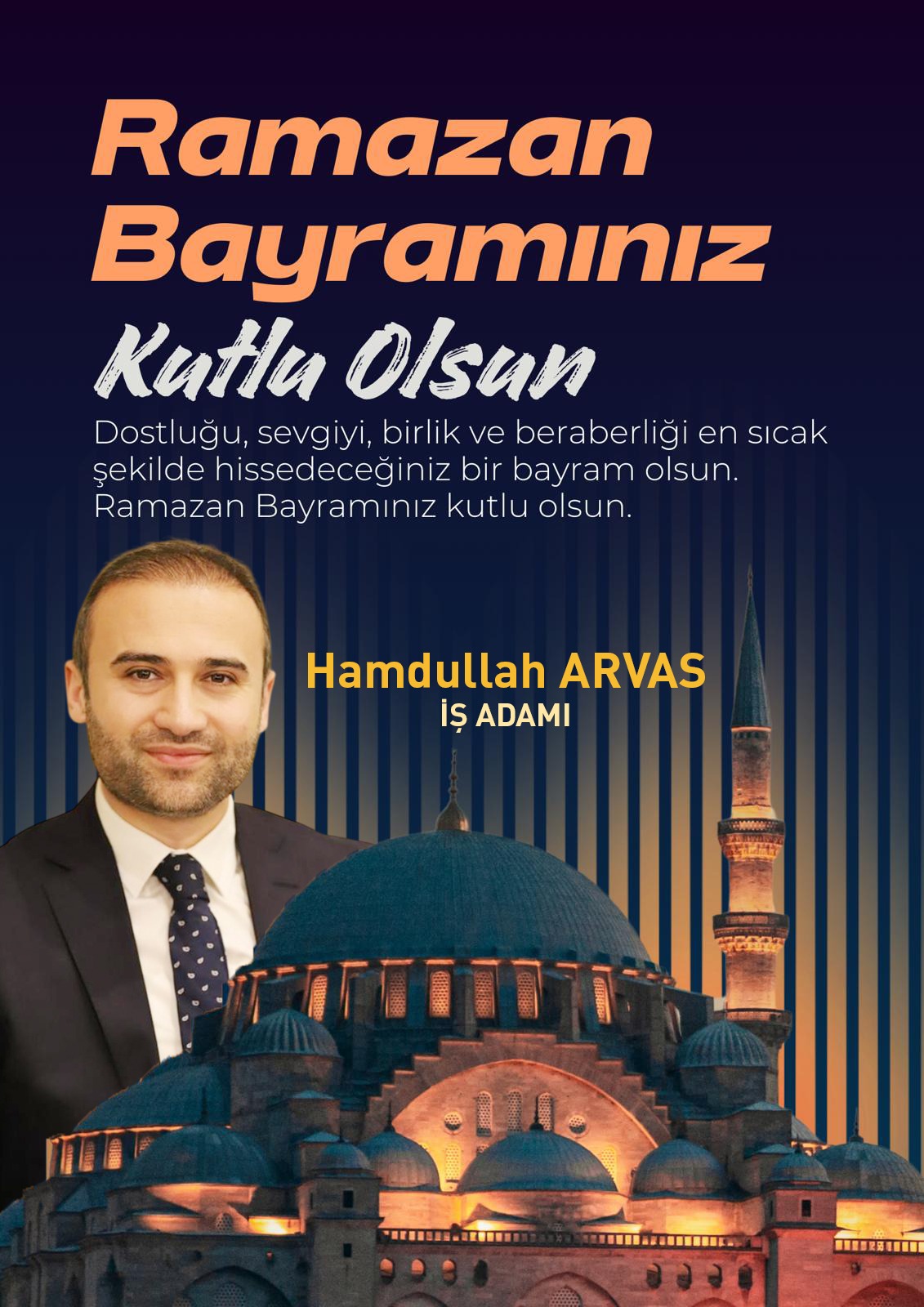 Hamdullah ARVAS – İŞ ADAMI: Bayramın bereketi, sofralarınıza; neşesi, kalplerinize dolsun. Sevdiklerinizle birlikte sağlıklı ve mutlu bir bayram geçirmeniz dileğiyle. İyi bayramlar.