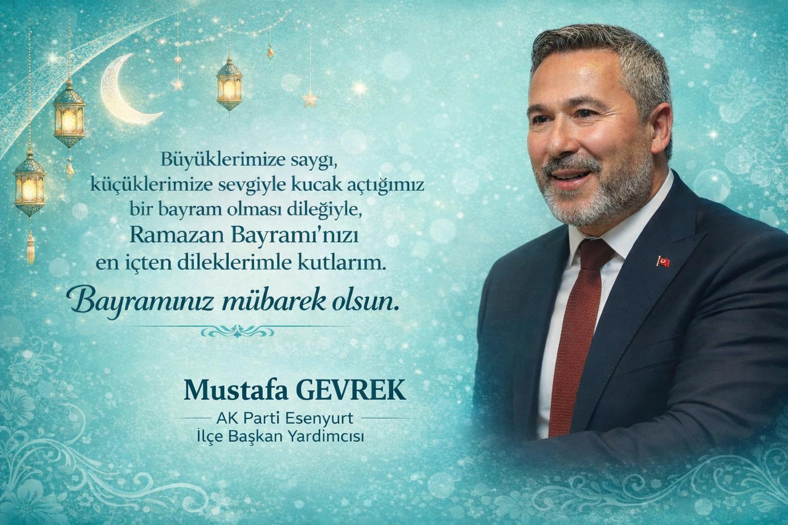Mustafa GEVREK – AK Parti Esenyurt İlçe Başkan Yardımcısı: Ramazan Bayramı’nın tüm bereketiyle yüreklere mutluluk ve manevi coşkular getirmesini dilerim. Bayramınız Mübarek Olsun.