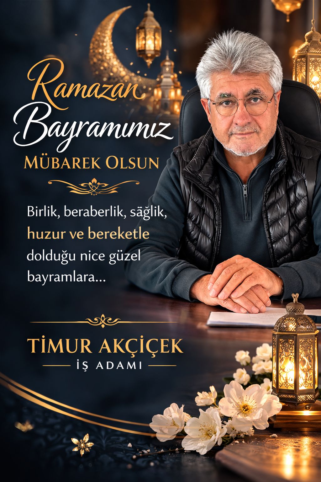 Timur AKÇİÇEK – İŞ ADAMI: Gecenin güzel yüzü yüreğine dokunsun, kabuslar senden uzakta melekler başucunda olsun, güneş öyle bir geceye doğsun ki, duaların kabul ve Ramazanın Bayramın Mübarek Olsun…