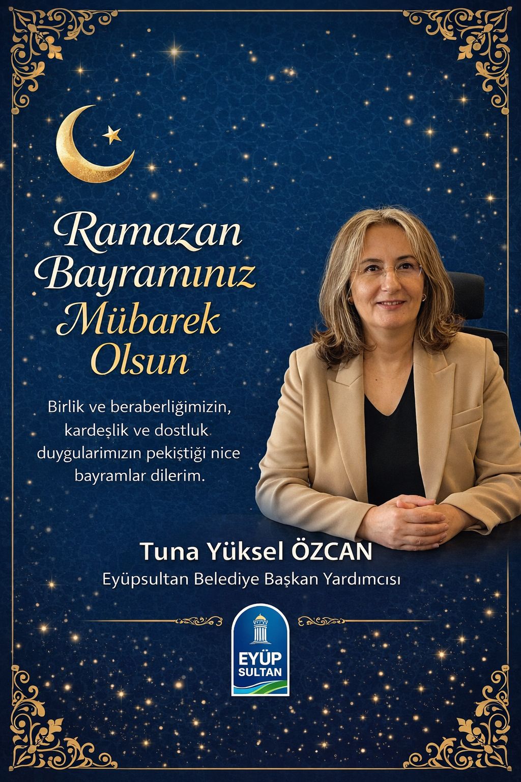 Tuna Yüksel ÖZCAN – Eyüpsultan Belediyesi Başkan Yardımcısı: Gönüller bir, sofralar bereketli, yüzler mutlu olsun. Ramazan Bayramınız mübarek olsun.
