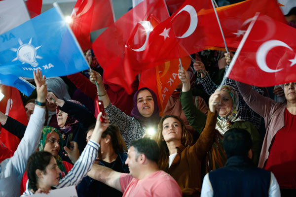 Supporters of Turkey’s President Recep Tayyip Erdogan’s ruling Justice and Development (AKP) Party, reach out to grab flowers he threw as he arrives to deliver his speech to outline his plans for after the elections and present MP candidates, in a rally in Ankara, Turkey, Thursday, May 24, 2018. Turkey will hold parliamentary and presidential elections on June 24, 2018, seen as important as it will transform Turkey’s governing system to an executive presidency. (AP Photo/Burhan Ozbilici)